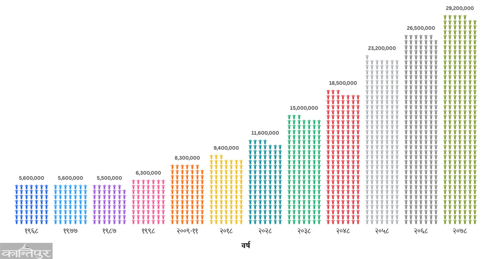 नेपाली योजनाकारहरू २०२८ मा जति नेपाली थिए त्यसको ३० वर्षमा दोब्बर हुन्छन् भन्ने अनुमान गरेर डराए (उनीहरूको अनुमान सही साबित भयो) । यसअघि योभन्दा कम दरले मानिस बढ्दा पनि प्रतिव्यक्ति राष्ट्रिय उत्पादन बढ्न पाएको थिएन । यसको केही समयपछि उनीहरूले नेपालको राष्ट्रिय उत्पादन बर्सेनि २.२ प्रतिशतका दरले मात्र बढेको, तर मानिस २.३ प्रतिशतका दरले बढेकाले प्रतिव्यक्ति आयमा घटेको थाहा पाए ।