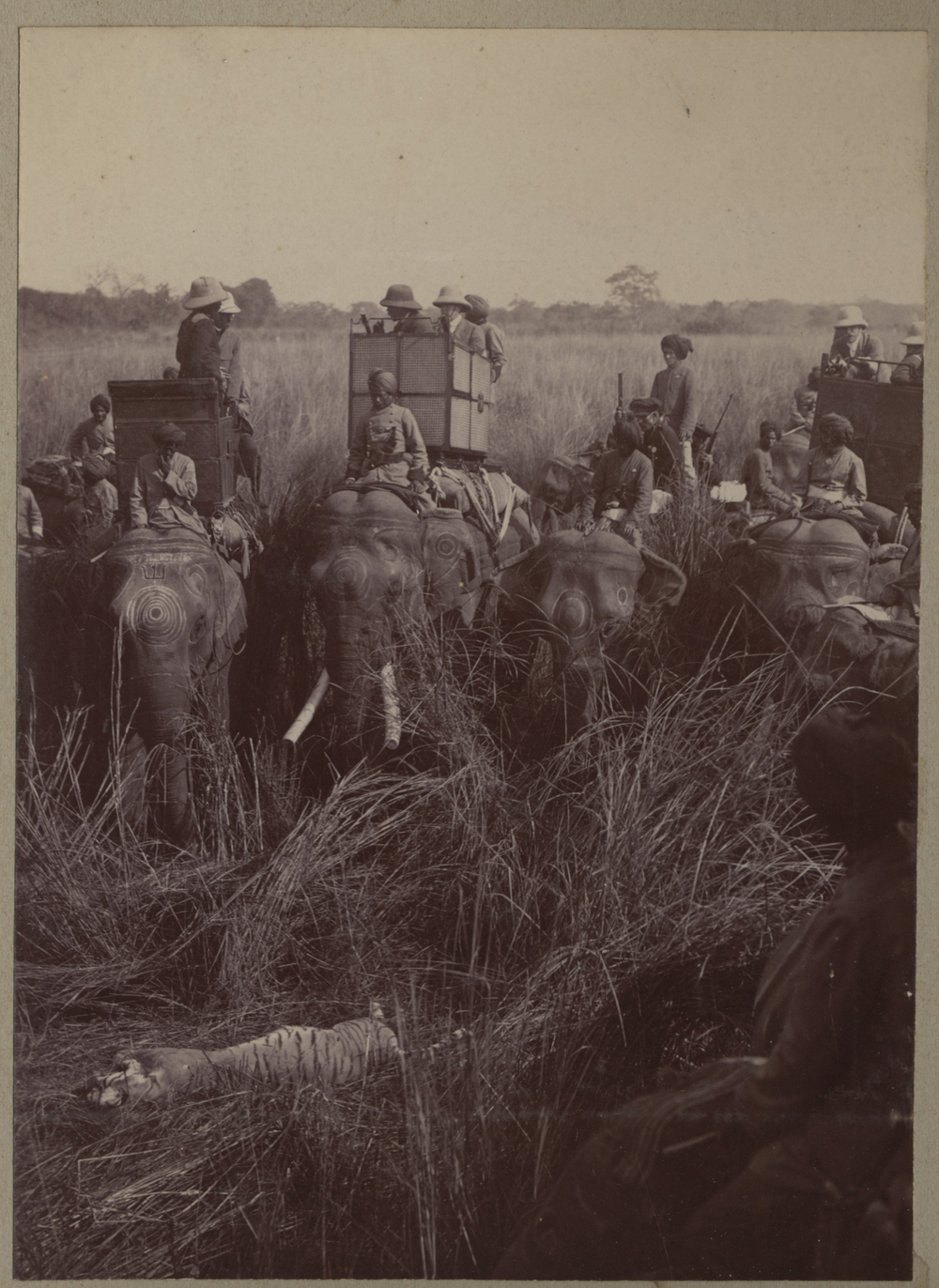 600 elephants, 12000 porters and 2000 servants were used for that hunting trip. On the way the king killed two tigers, which were surrounded by a herd of elephants for their prey. Then, after a motor-journey of 19 miles, Lord Duhram killed a tiger and a rhinoceros, King George two rhinoceroses, and Lord Annaly one rhinoceros. After killing three tigers and three rhinoceroses, they moved to breakfast,' says the research paper printed by Kiis Rookmakar based on the paper of the university.