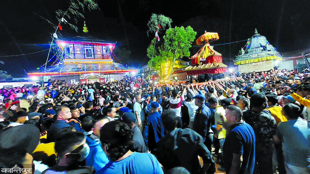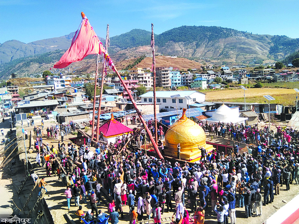 This is Jumla's Jatra description. All around are houses with mud roofs. Chandannath Bhairavnath Guthi's shera has rice stalks hanging from the tree. On top of that, the beauty of the 52 hand linga installed in the Chandananath Bhairavanath temple kept everyone's attention. You have to climb the hill to see the 52-handed lingo that is placed in the temple. Chandannath Bhairavanath Temple, which is a religious heritage of Karnali, is in danger. Ghatasthapana on the first day of Dasain. In Jumla, there is a custom to desecrate only the Lingo Ferrer of Chandannath Bhairavnath Temple. On this day, devotees from all over the district descend on Khalanga, the headquarters. It is customary to celebrate this day which happens once a year. Since there are 52 weeks in a year, it is customary to keep a lingo of 52 hands in the temple. Lingo is made by cutting green Salla trees. The lingo is covered with red and white colorful cloth. It is decorated with a label on the top. On this day, morning food is eaten only after erecting a lingo in the temple.