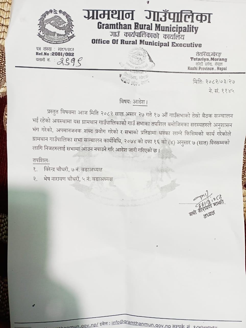 आदेशमा भनिएको छ, '२०८२ असार २७ गते ग्रामथान गाउँपालिकाको १७औँ गाउँसभाको तेस्रो बैठकमा दुवै वडाध्यक्षले अनुशासन भंग गर्ने, अपमानजनक भाषा प्रयोग गर्ने र सभाको प्रतिष्ठामा आँच पुर्याउने कार्य गरेका कारण, गाउँसभा सञ्चालन कार्यविधि, २०७४ को दफा १६(४) अनुसार सात दिनका लागि बैठकमा निषेध गरिएको हो ।'
