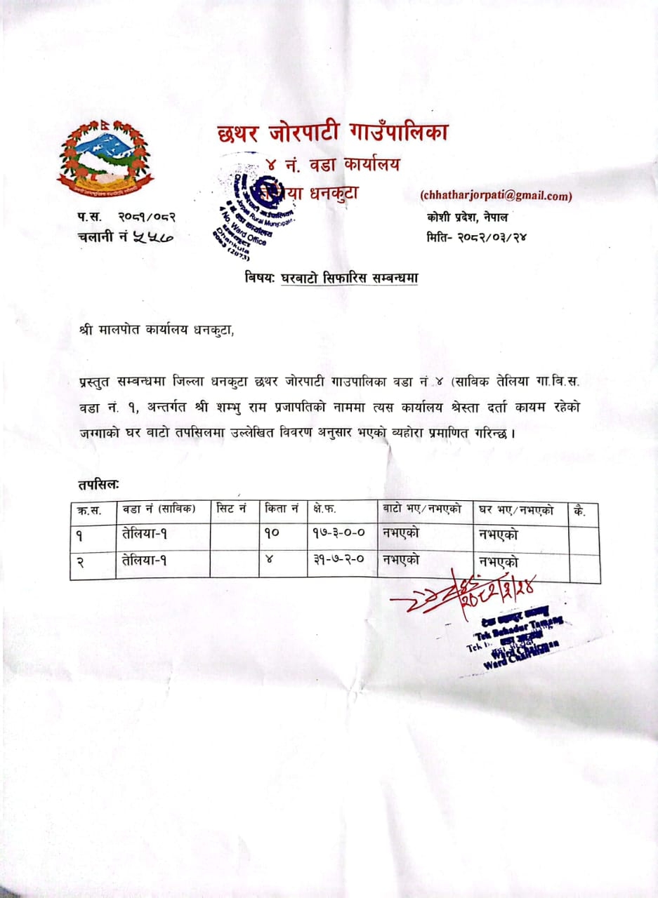 धनकुटा — राजस्व छल्ने उद्देश्यले धनकुटाको छथर जोरपाटी गाउँपालिका-४ वडा कार्यालयको लेटरप्याड, छाप र वडाध्यक्षको हस्ताक्षर किर्ते गरिएको छ ।
