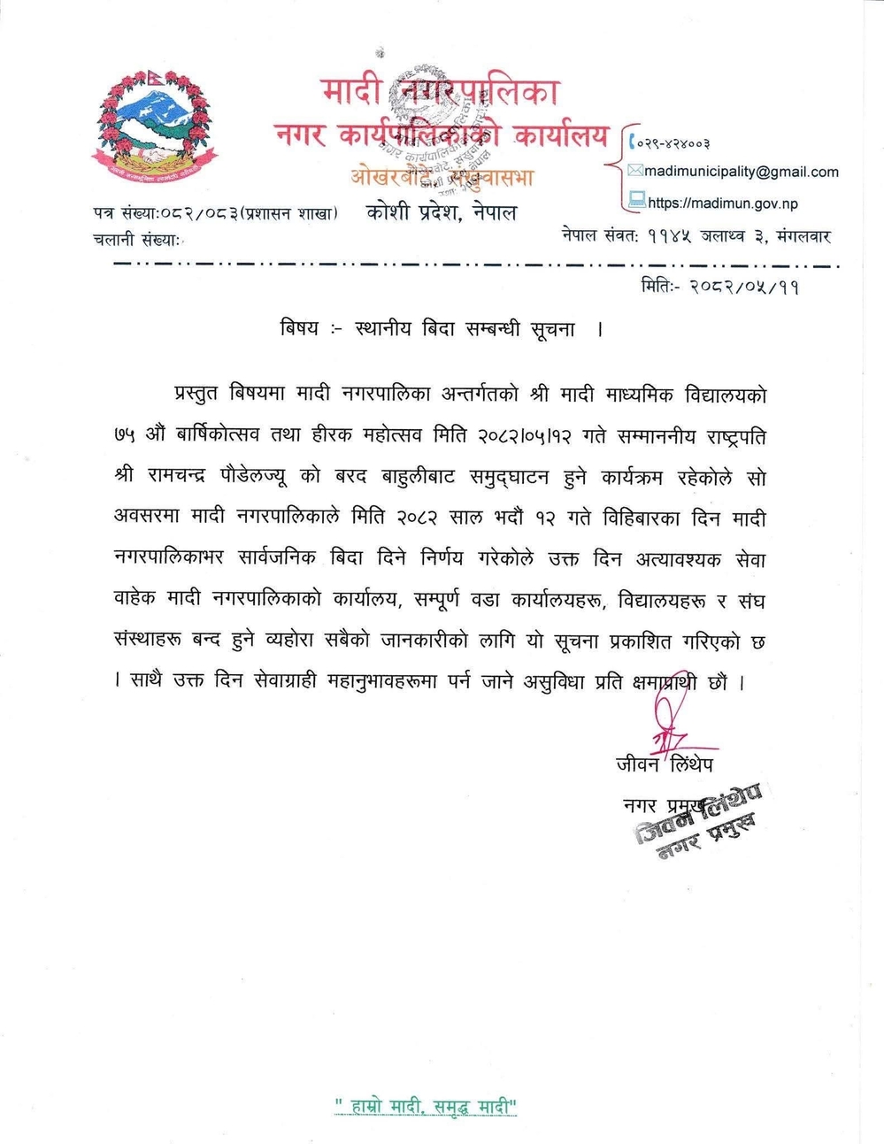 राष्ट्रपति पौडेलले मादी माध्यमिक विद्यालयको ७५औं वार्षिकोत्सव तथा हिरक महोत्सवको उद्घाटन गर्ने कार्यक्रम रहेको छ ।