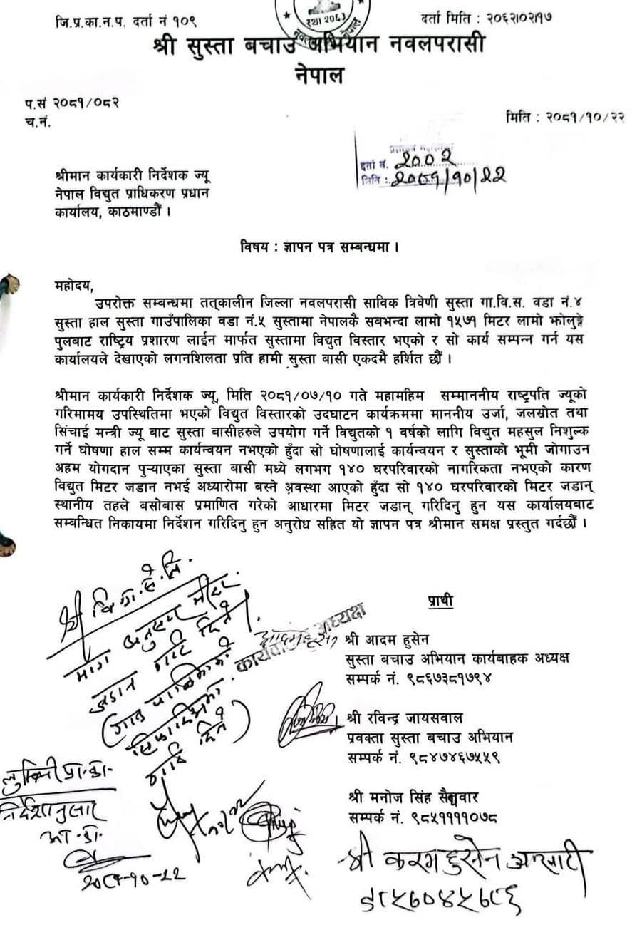 State MP and Forest and Environment Minister of Lumbini Province Devkaran Jaishwal, acting chairman of 'Susta Bachau Abhiyan' Adam Hussain, spokesperson Ravindra Jaishwal, and a team led by the executive director of Electricity Authority, Kulman Ghising, submitted a memorandum demanding installation of electricity meters. While understanding the memorandum, the executive director Ghising instructed the subordinate agencies to install electricity meters based on the recommendations of the local level, even if there is no citizenship or Lalpurja, campaign spokesperson Jaiswal said.