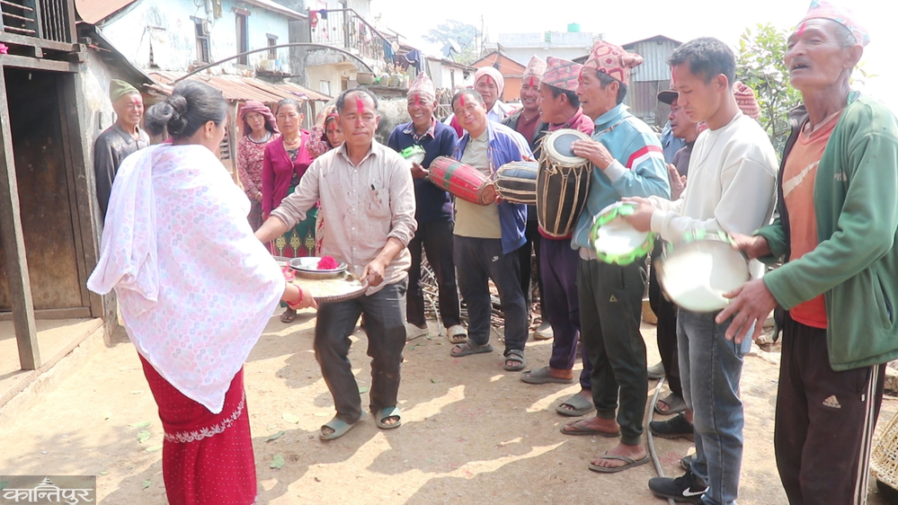 पाल्पा — हा...पूर्वै दिशा आयो जोगी बस्यो आँगन....हामी कसरी खेलौ रंग आँगन...घरघरै भिख मागन...यी र यस्तै गीत आएर पाल्पाको निस्दी गाउँपालिका–४, मित्यालको टोलटोलमा बुधबारदेखि फागु खेलिएको छ । यहाँका ६७ वर्षीय पुर्खसिंह गाहाले गीत निकाले । उनका साथीहरू ५६ वर्षीय खड्गसिंह गाहालगायतका टोलीले गीतलाई साथ दिए । रमाइलोसंग परम्परागत फागु खेलेको देख्दा जो कोहीको मनै लोभिन्छ ।