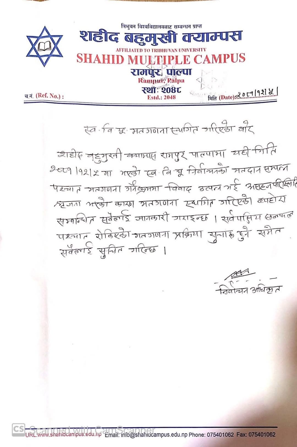 ५७१ मत खसेको सहिद बहुमुखी क्याम्पसमा केही मत गणना गर्न बाँकी रहँदा विवाद सिर्जना भएकाले नेविसंघका प्रतिनिधि गणनास्थलबाट उठेर हिँडेको र बाहिरी वातावरण असहज बनेकाले तीन राउन्ड हवाई फायर गरेर भीड तितरबितर पारेको प्रहरीले जनाएको छ ।