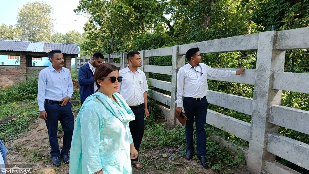 ठाकुरबाबा नगरपालिका-४ सैनवारस्थित हात्ती छेकबार पर्खाल शुक्रबार अनुगमन गर्दै उपप्रमुख सहितको टोली । तस्बिर : रामप्रसाद चौहान/कान्तिपुर