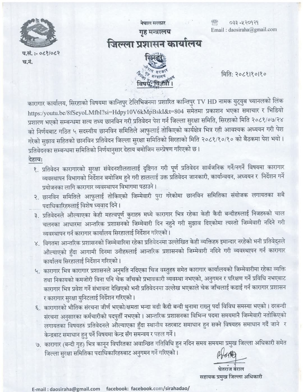 कारागार प्रकरणको ढाकछोपको आरोपछि जिल्ला प्रशासन कार्यालय, सिरहाले ७ बुँदे विज्ञप्ति जारी गर्दै जानकारी, कार्यान्वयन, अध्ययन र निर्देशन गर्ने प्रयोजनका लागि प्रतिवेदन विभागलाई पठाइएको उल्लेख गरेको छ ।