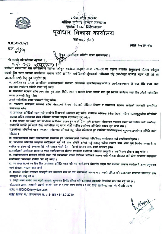 Ward presidents and former mayors submitted a memorandum to Chief District Officer Lalbabu Kawadi and accused the Madhesh state government of selling the scheme through middlemen. They have also warned that the infrastructure development office will be locked.