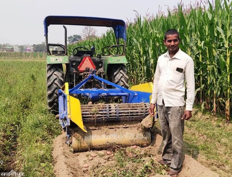 He plants Arun Gold and Ketu varieties of potatoes . They produce 600 quintals of potatoes at the rate of 10 quintals per town. In this way, about 1,200 quintals of potatoes are produced in a year. He has purchased a potato planter machine for planting potatoes for 4 lakh rupees and is doing the planting from it. He has earned 2 lakh rupees by renting this machine for 2 years. The Potato Drigger machine for uprooting potatoes has been provided by Agricultural Tools Research Center, Ranighat, Birgunj.