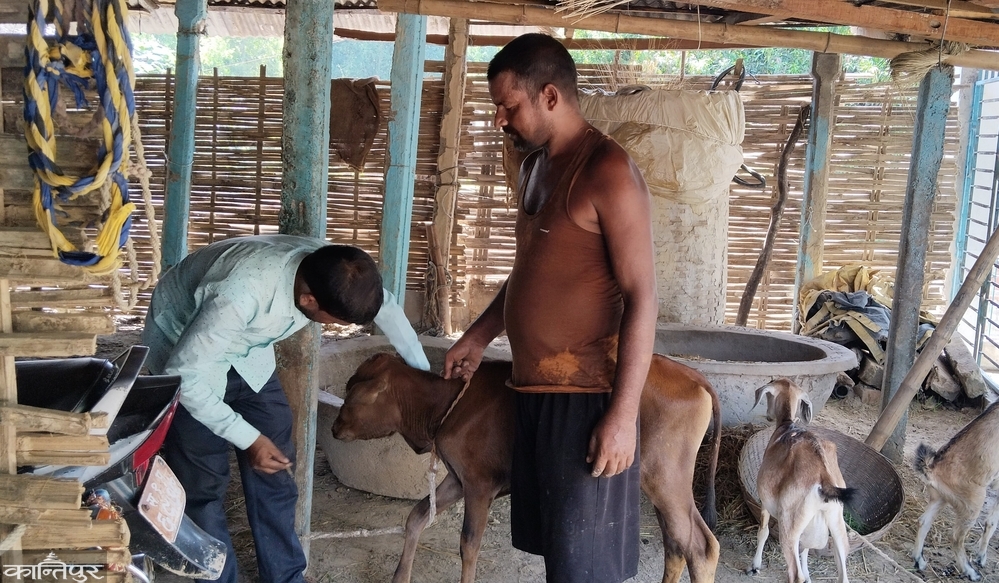 Bishnupur Rural Municipality-1 Khuruhuria and Rajgarh Rural Municipality-5 Malekpur in the same region JT Santosh Kumar Yadav, a local veterinarian of Chaupaya, is giving first aid. According to him, ``lumpy skin'' infection has been observed in more than a dozen cattle in Khuruhuria and Malekpur. Symptoms of fever, less feed and water consumption and roundness of the skin have been observed in those four-footed animals.