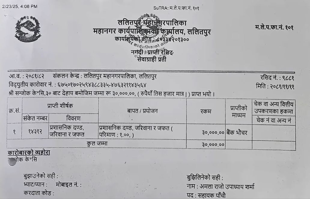 ललितपुर नगर प्रहरी प्रमुख सीताराम हाछेथुका अनुसार नख्खुमा मिक्स्चरले गिट्टी खसाली फोहोर गरेकोमा सन्जोक केसीलाई ३० हजार रुपैयाँ जरिवाना गरिएको हो । उनलाई प्रशासनिक दण्ड, जरिवाना र जफतमार्फत जरिवाना गराइएको हो ।