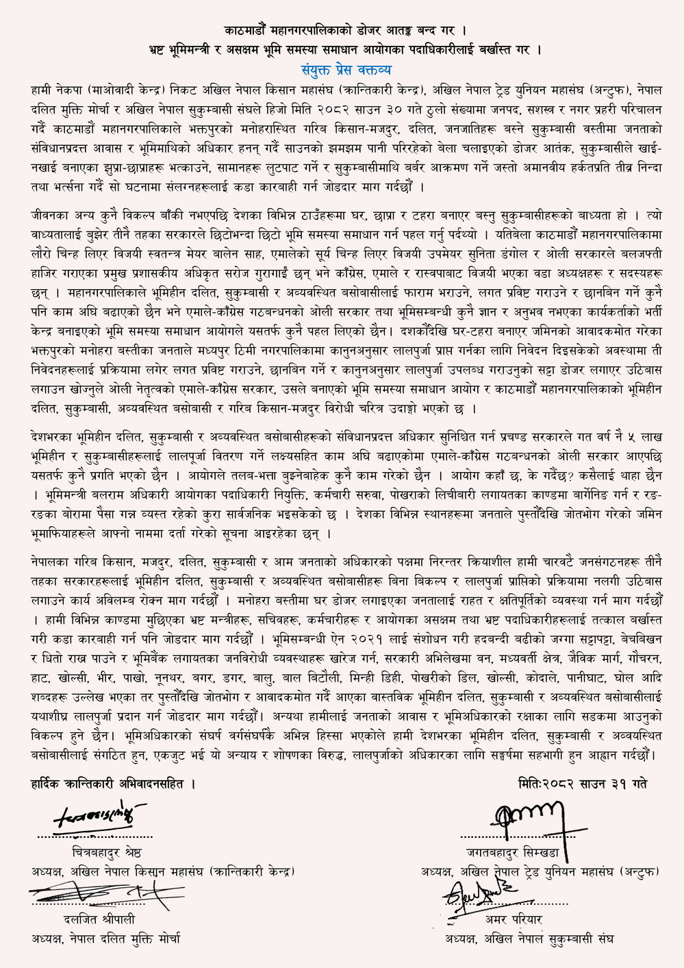 महानगरपालिकाले प्रहरी र नगर प्रहरी परिचालन गर्दै गरिब किसान, मजदुर, दलित र जनजाति सुकुम्वासी बसोबासीमाथि गरिएको आक्रमण अमानवीय भएको आरोप लगाएका छन् । झमझम वर्षाको समयमा झुप्रा र छाप्रा भत्काउने, सामान लुटपाट गर्ने र सुकुम्वासीलाई उठिबास लगाउने कामले संविधानप्रदत्त आवास तथा भूमिअधिकार हनन् भएको वक्तव्यमा उल्लेख छ ।