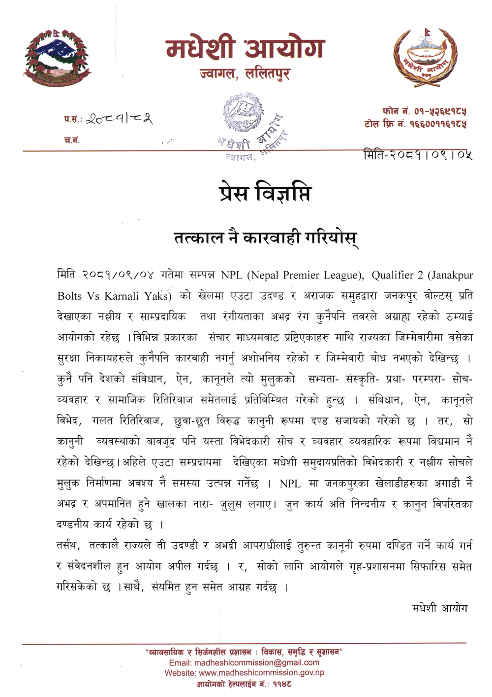 The Madheshi Commission has recommended to the government to take action against the defiant and chaotic groups that show sexual and communal behavior in the Nepal Premier League (NPL). The commission said that in the match between Janakpur Bolts and Karnali Yaks under Qualifier-2 of NPL, a defiant and chaotic group showed sexual and communal behavior towards Janakpur Bolts.