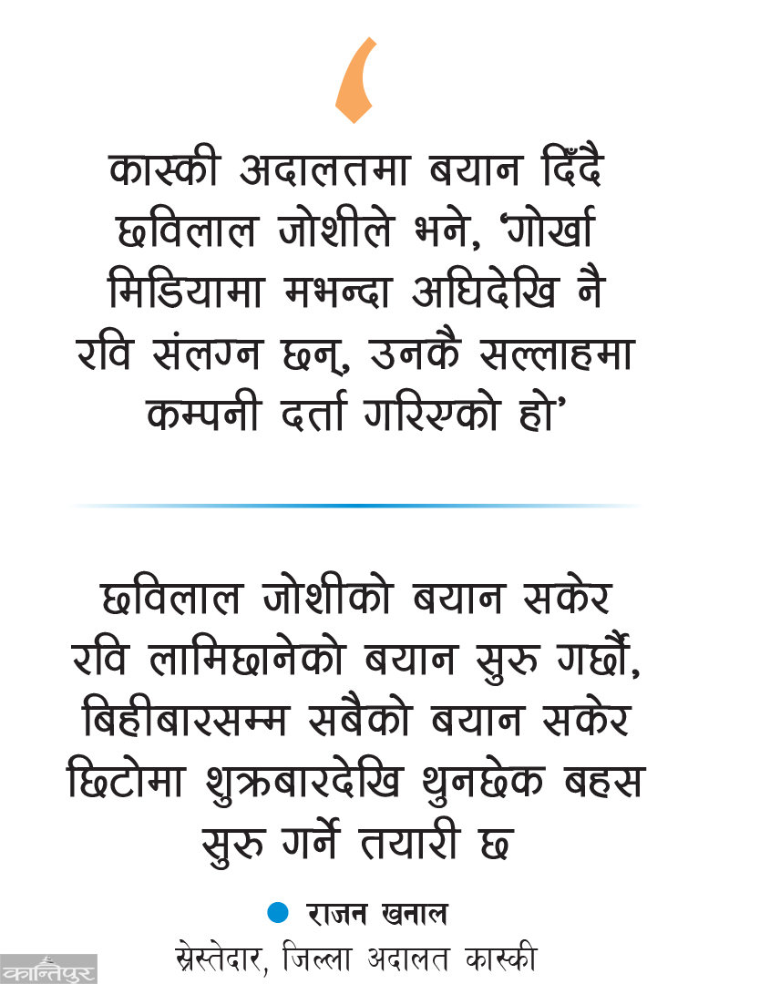 कास्की अदालतमा बयान दिँदै छविलाल जोशीले भने, ‘गोर्खा मिडियामा मभन्दा अघिदेखि नै रवि संलग्न छन्, उनकै सल्लाहमा कम्पनी दर्ता गरिएको हो’
