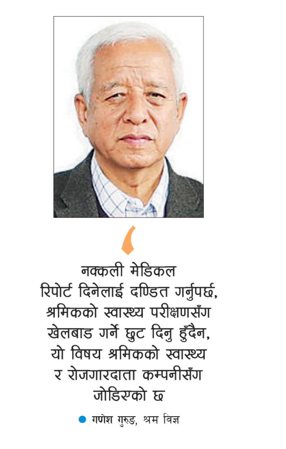 नक्कली मेडिकल रिपोर्ट दिनेलाई दण्डित गर्नुपर्छ, श्रमिकको स्वास्थ्य परीक्षणसँग खेलबाड गर्ने छुट दिनु हुँदैन, यो विषय श्रमिकको स्वास्थ्य र रोजगारदाता कम्पनीसँग जोडिएको छ । - गणेश गुरुङ, श्रम विज्ञ