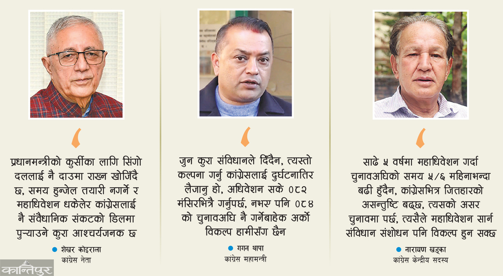 संविधानको राजनीतिक दलसम्बन्धी व्यवस्थालाई टेकेर हेर्ने हो भने थप ६ महिना समय उपलब्ध हुन सक्छ । संविधानको धारा १६९ को उपधारा ४ (ख) ले साढे पाँच वर्षभित्र महाधिवेशन गराउनुपर्ने बाध्यात्मक व्यवस्था गरेको छ । यो हिसाबले ०८४ को जेठभित्र १५ औं महाधिवेशन गर्न नसके कांग्रेस दलमाथि नै संवैधानिक संकटको प्रश्न उठ्ने छ ।