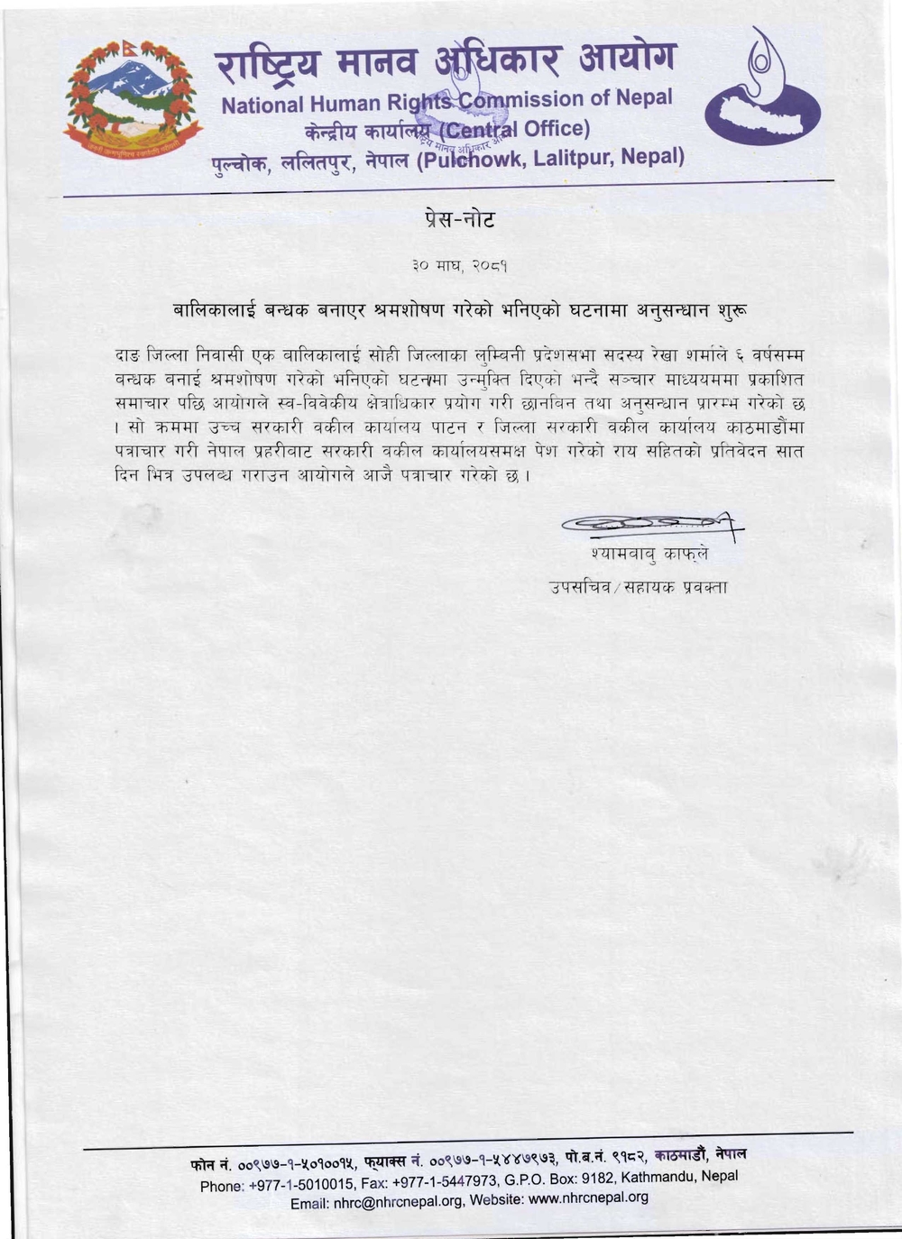 बालश्रमिक राखेको मुद्दामा सरकारी वकिलले मुद्दा नचलाउने तयारी गरिरहेको भन्दै सञ्चारमाध्यममा समाचार आएलगत्तै आयोगले अनुसन्धान सुरु गरेको हो ।