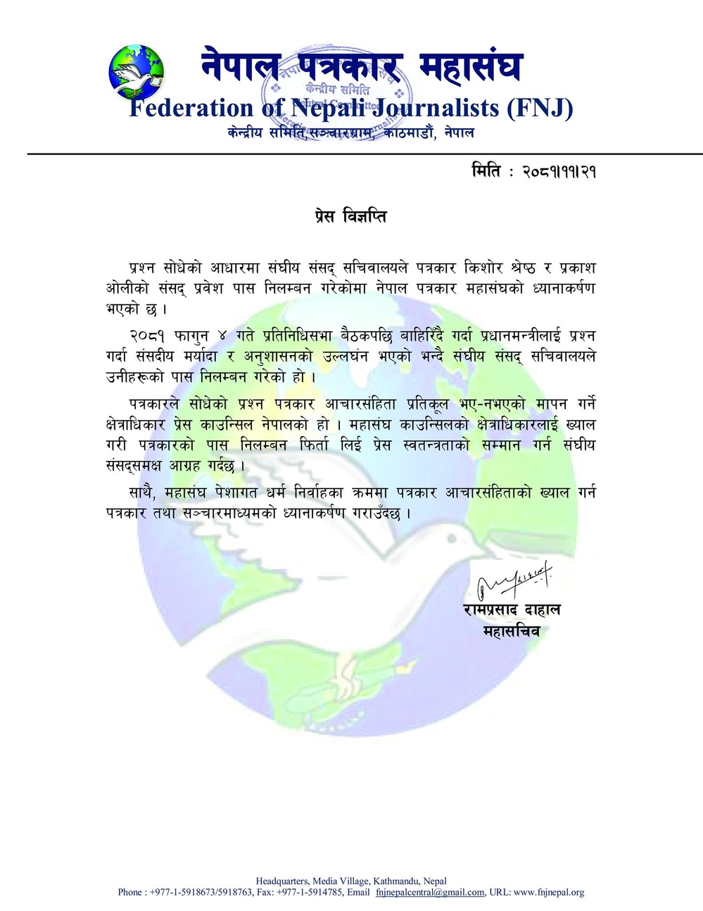 महासंघले काउन्सिलको क्षेत्राधिकारलाई ख्याल गरी पत्रकारको पास निलम्बन फिर्ता लिई प्रेस स्वतन्त्रताको सम्मान गर्न संघीय संसद्लाई आग्रह गरेको छ । पेशागत धर्म निर्वाहका क्रममा पत्रकार आचारसंहिताको ख्याल गर्न पत्रकार तथा सञ्चारमाध्यलाई समेत महासंघले ध्यानाकर्षण गराएको छ ।