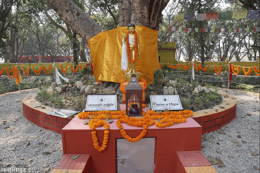 The 'Flame of Hope' (light of hope) has been lit by a mixture of lamps brought from 15 places in 9 countries in the old Rajkiya Vihar (Nepal Temple) in Lumbini. The lamp is lit from a mixture of lamps collected from various places in the Netherlands, Japan, America, Italy, France, Israel, India, Nepal and Palestine.
