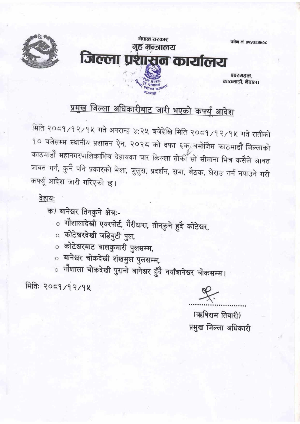 The decision to impose curfew was made after a discussion in the Ministry of Home Affairs with the Minister of Home Affairs, Ramesh Akhtar, Inspector General of Police, Deepak Thapa, Chief District Officer of Kathmandu, Rishiram Tiwari. Assistant Chief District Officer Ashok Kumar Bhandari, who is also the Information Officer of the District Administration Office, Kathmandu, said that the information will be uploaded shortly.