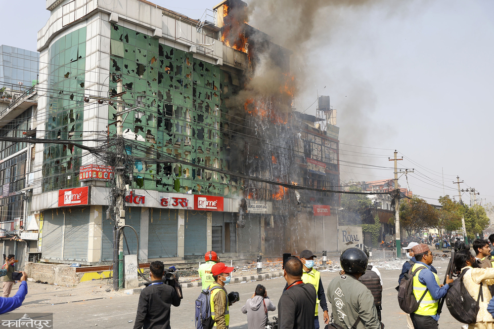 On Friday, the royalists set fire to a building in a demonstration focused on Thinkune of Kathmandu. Suresh, a photojournalist of Avenues Television, was shooting the same scene. He died in the fire.
