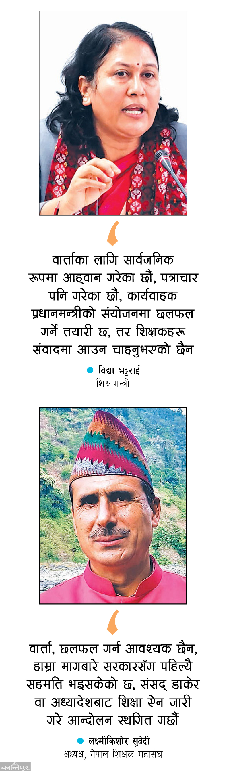 तर शिक्षकहरू संवादमा आउन चाहनुभएको छैन,’ उनले भनिन् । शुक्रबार कार्यवाहक प्रधानमन्त्री, गृहमन्त्री, सत्तारूढ र प्रतिपक्षी दलका सचेतकहरू छलफलका लागि भेला भए पनि शिक्षक प्रतिनिधि नआएको मन्त्री भट्टराईले बताइन् । ‘शिक्षकहरू ऐन चाहियो मात्र भन्नुहुन्छ । विधेयक समितिअन्तर्गतको उपससमितिमा दफाबार छलफलको चरणमा छ । त्यसको पनि एउटा प्रक्रिया हुन्छ । वार्तामा बोलाउँदा पनि आउनुभएन,’ भट्टराईले भनिन्, ‘फोनमा कुराकानी भएको छ । तर औपचारिक संवाद हुन सकेको छैन ।’