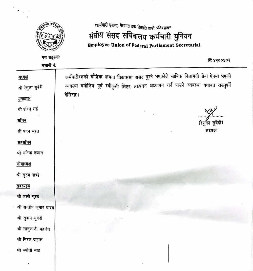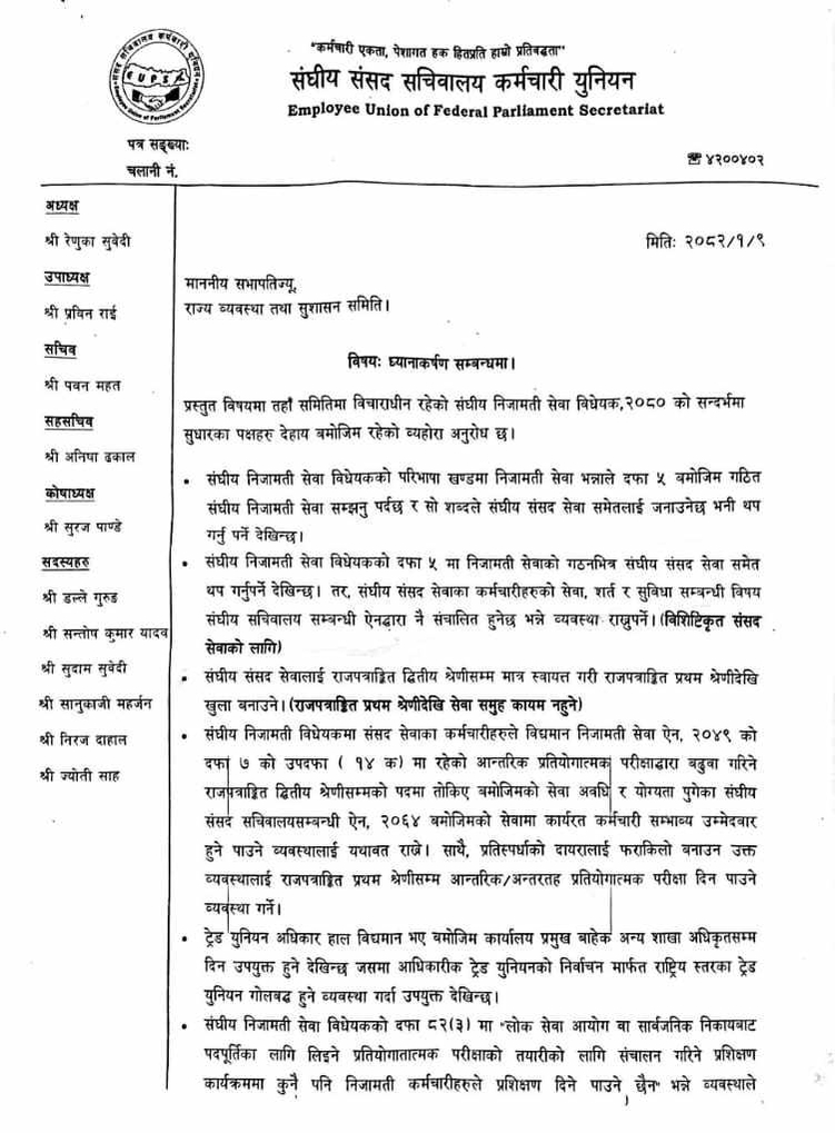 Federal Parliament Secretariat Staff Union President Renuka Subedi said that the proposal made in the Federal Civil Service Bill is not correct. Section 82 (3) of the bill proposes, 'No civil servant shall be allowed to train in the training program conducted for the preparation of the competitive examination to be taken by the Public Service Commission or the public body for filling the posts.'
