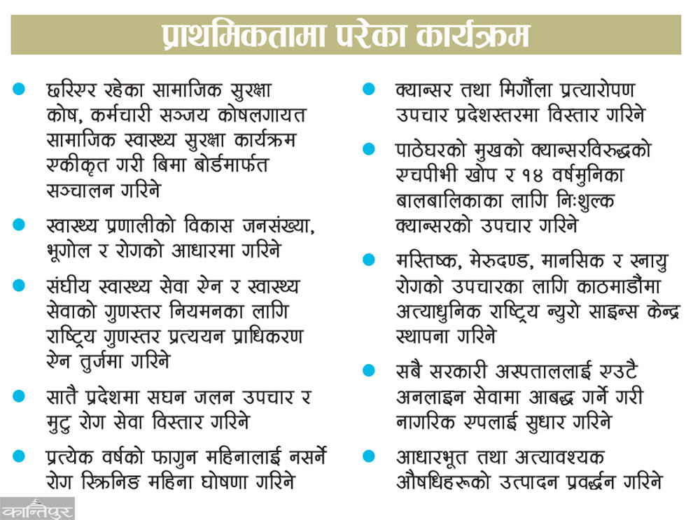 Similarly, the government has introduced programs such as the 'Healthy Nepal Campaign', the month of February every year will be declared as the month of non-communicable disease screening. There is a plan to establish a state-of-the-art National Neuroscience Center in Kathmandu for treatment of acute burns and heart disease, expansion of cancer and kidney transplant treatment in all seven provinces, free cancer treatment for children under 14 years of age, treatment of brain, spinal cord, mental and neurological diseases.