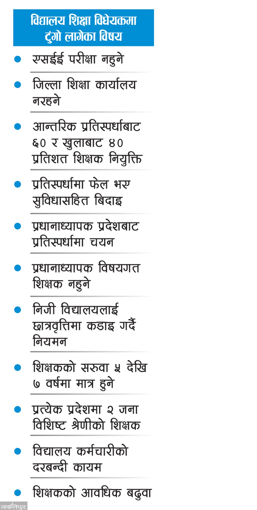 It has been agreed that there will be no SEE exam, no district education office, 60 percent of teachers will be appointed from internal competition and 40 percent will be appointed from open competition, principals will be appointed through competition from the state and private schools will be regulated on scholarships.