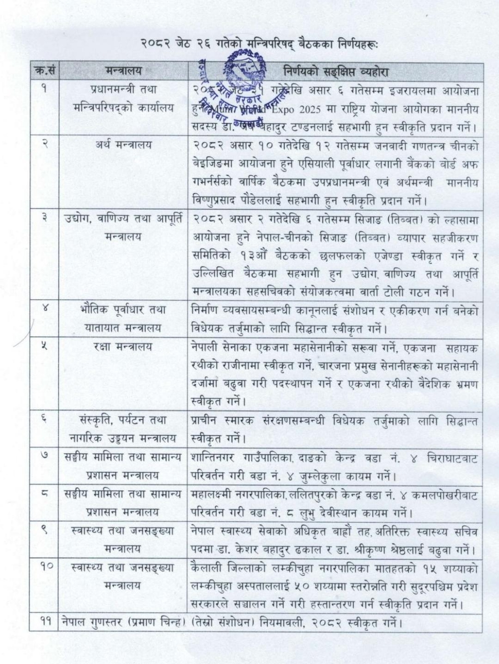 सरकारले कैलालीको लम्कीचुहा अस्पताललाई १५ श्ययाबाट ५० शय्यामा स्तरोन्नति गरी प्रदेश सरकारले सञ्चालन गर्ने गरी हस्तान्तरण गर्न स्वीकृति प्रदान गर्ने निर्णय गरेको सरकारका प्रवक्ता समेत रहेका मन्त्री गुरुङले बताए । सरकारले २०८२ जेठ ३१ गतेदेखि असार ६ गतेसम्म इजरायलमा आयोजना हुने ‘मुनि वर्ल्ड एक्स्पो–२०२५’ मा राष्ट्रिय योजना आयोगका सदस्य डा जयबहादुर टण्डनलाई सहभागी हुन स्वीकृति प्रदान गर्ने निर्णय गरेको उनले जानकारी दिए ।