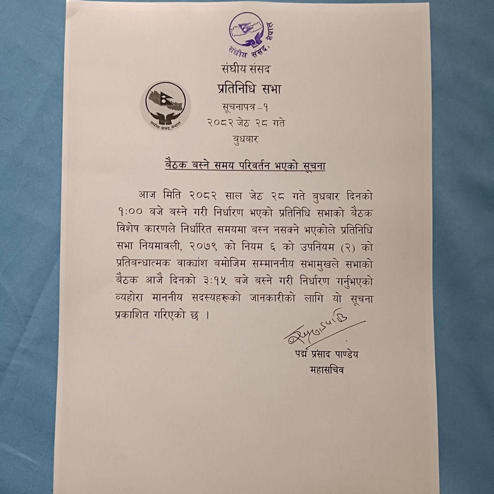 काठमाडौँ — भिजिट भिसा प्रकरणको छानबिन कसरी गर्ने भन्नेमा दलहरूबीच सहमति नहुँदा प्रतिनिधिसभा बैठक फेरि एकपल्ट सरेको छ । बुधबार दिउँसो १ बजेका लागि बोलाइएको बैठक ३:१५ का लागि सारिएको सभामुखको सचिवालयले जनाएको छ ।