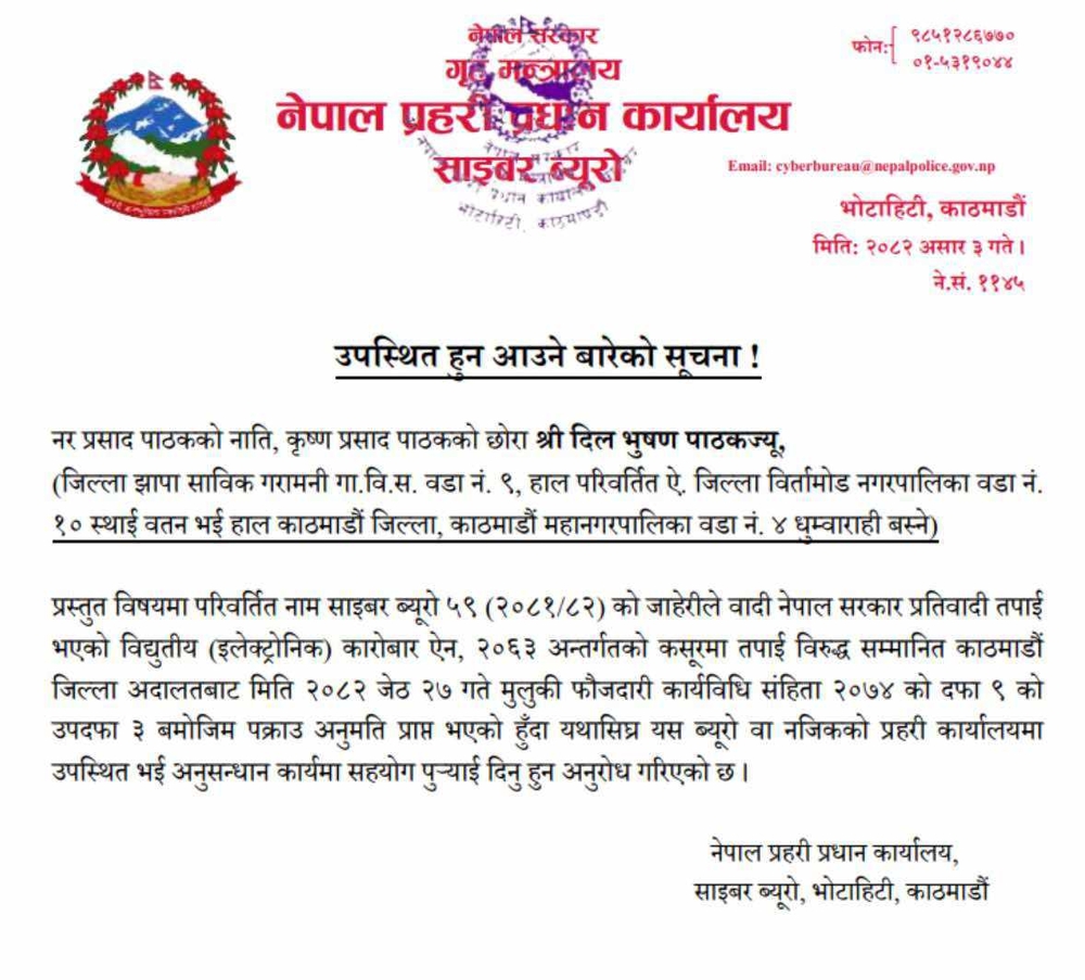 The cyber bureau of the police has issued a notice asking journalist Dilbhushan Pathak to appear before the police. The Cyber Bureau filed a case in court under the Electronic Transactions Act and obtained permission to arrest the reader.