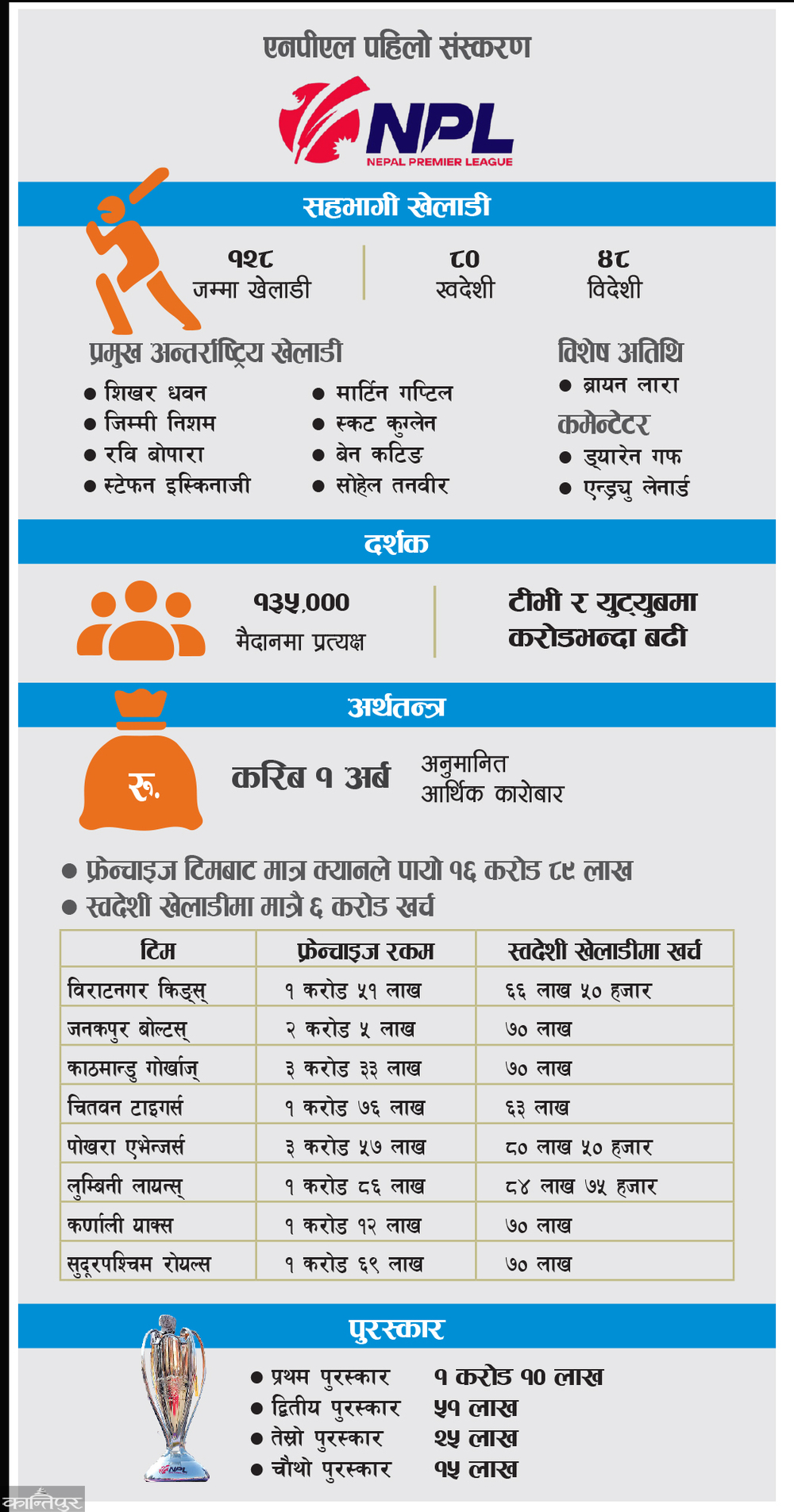 In the first edition of NPL, more than 100 crores were traded from all sides. Its live broadcast was also done by the international channel "Star Sports". The NPL-1 winner was awarded 11 million and the runner-up was awarded 51 million.