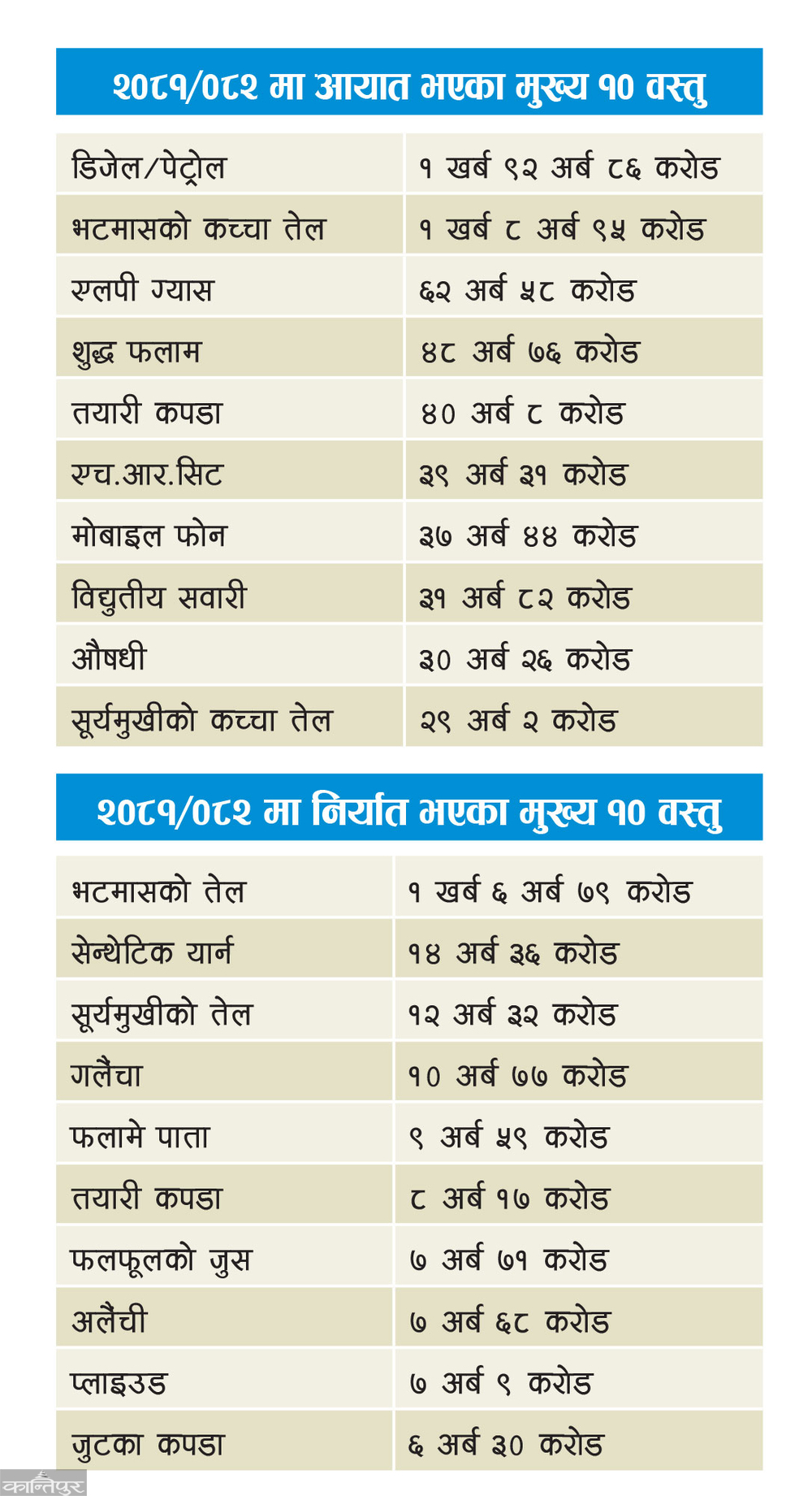 The export of edible oil seems to be the main reason for the almost doubling of exports in one year. In the financial year 081/82, soybean, sunflower and palm oil were exported worth 1 trillion 21 billion 52 crores. In the same year, there is a data of 1 trillion 44 billion 78 billion soybean, sunflower and palm raw material imported. The import of raw materials has also tripled abnormally compared to the previous year. In 080/81, crude oil worth 41.93 billion was imported.