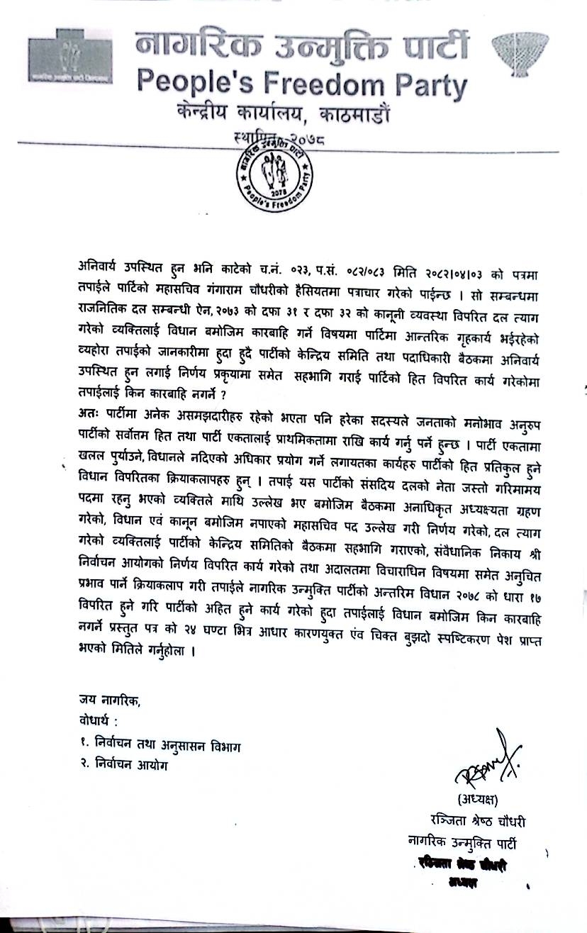 काठमाडौँ — नागरिक उन्मुक्ति पार्टीको विवाद चर्किँदै गएको अवस्थामा अध्यक्ष तथा सांसद रञ्जिता श्रेष्ठले संसदीय दलका नेता गंगाराम चौधरीलाई स्पष्टिकरण सोधेकी छन् । पार्टी हितविपरीत, विधान र राजनीतिक दलसम्बन्धी ऐनका प्रावधानविपरीत कार्य गरेकाले कारबाही किन नगर्ने ? भने अध्यक्ष श्रेष्ठले दलका नेता चौधरीलाई स्पष्टीकरण सोधेकी हुन् ।