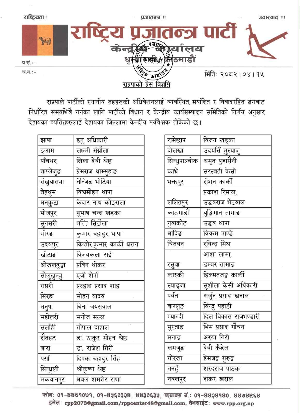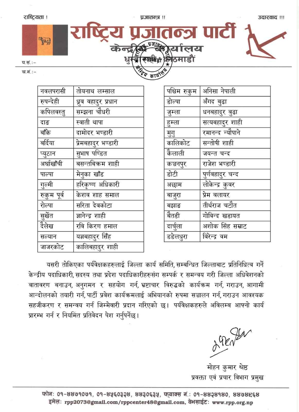 Rashtriya Prajatantra Party has appointed a central supervisor for district and local level elections. According to Mohan Kumar Shrestha, Party Spokesperson and Head of Publicity Department, central observers have been appointed for the convention in all 77 districts.