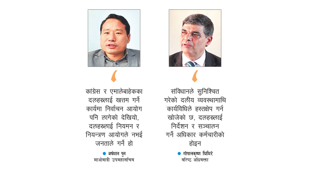 नेपाल बार एसोसिएसनका पूर्वअध्यक्ष वरिष्ठ अधिवक्ता गोपालकृष्ण घिमिरेले निर्वाचन आयोगले अघि सारेको कार्यविधिले संविधानले सुनिश्चित गरेको दलीय व्यवस्थामाथि हस्तक्षेप गर्न खोजेको टिप्पणी गरे । ‘राजनीतिक दललाई निर्देशन, सञ्चालन गर्ने गरी कर्मचारी, आयोगको सचिवको नेतृत्वमा समिति गठन गर्नु गलत हुन्छ,’ उनले भने, ‘राजनीतिक दललाई निर्देशन र सञ्चालन गर्ने अधिकार कर्मचारीको होइन । यस्तो व्यवस्था गरेर बिस्तारै दलीय व्यवस्था खुम्च्याउन खोजेको देखिन्छ ।’