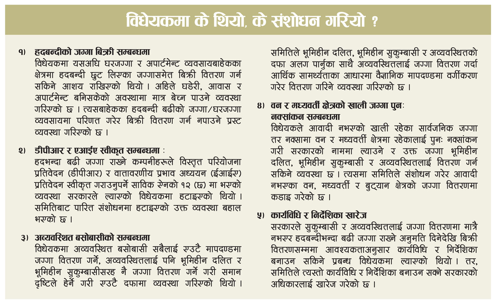 The government was in the process of passing the bill through 'fast track' with the goal of distributing land to more than 5 lakh landless Dalits and landless squatters and unorganized residents within the current financial year. The bill was also put on the agenda of the Parliament on June 25 on the instructions of the Prime Minister KP Sharma Oli to be passed directly from the "full house" without being sent to the committee.