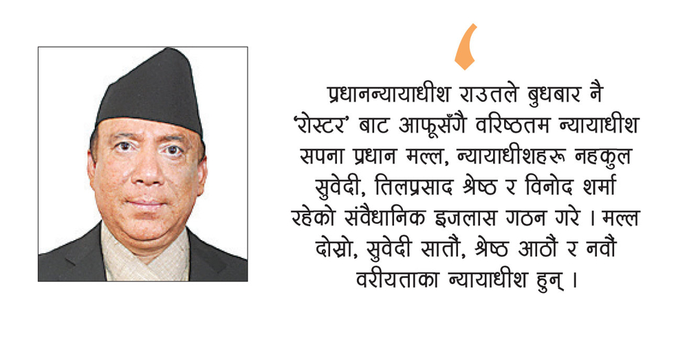 प्रधानन्यायाधीश राउतले बुधबार नै ‘रोस्टर’ बाट आफूसँगै वरिष्ठतम न्यायाधीश सपना प्रधान मल्ल, न्यायाधीशहरू नहकुल सुवेदी, तिलप्रसाद श्रेष्ठ र विनोद शर्मा रहेको संवैधानिक इजलास गठन गरे । मल्ल दोस्रो, सुवेदी सातौं, श्रेष्ठ आठौं र नवौं वरीयताका न्यायाधीश हुन् ।