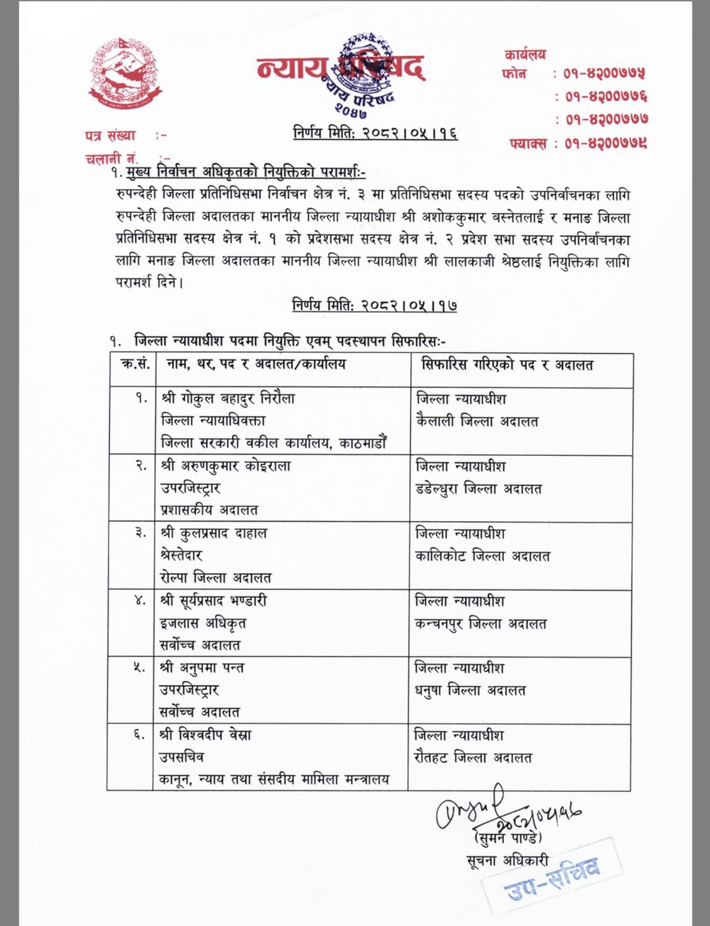 The council has recommended four people, one government lawyer and one legal service officer to the district judge. The Judicial Council meeting presided over by Chief Justice Prakashman Singh Raut appointed District Attorney Gokul Bahadur Niraula to Kailali, Sub-Registrar Arun Kumar Koirala to Dadeldhura, Srestedar Kul Prasad Dahal to Calikot, Bench Officer Surya Prasad Bhandari to Kanchanpur, Sub-Registrar Anupama Pant to Dhanusha and Deputy Secretary Vishwadeep Vesra to Rautahat District Court. Has also been appointed .