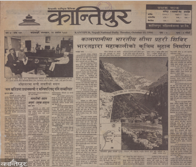 The news published on the front page under the title 'Indian Border Police Camp at Kalapani, Construction of Mahakali's artificial spring by India' highlighted the presence of Indian Border Security Force in the Kalapani area of Nepal's Darchula district. In the news, India revealed that it has set up a camp of the Indo-Tibetan Border Police (ITBP). It was also mentioned in the news that an artificial spring has been constructed with the aim of changing the origin of the Mahakali river. It was mentioned in the news that this area has been under the control of the Indian Army since the Indo-China war of 1962 .