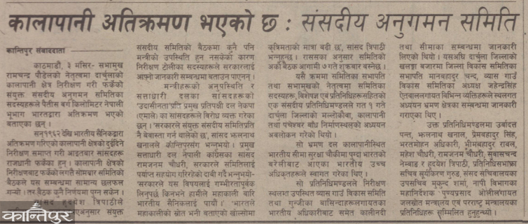 news, a parliamentary committee of inquiry was formed . The Parliamentary Inquiry Committee was headed by the then Speaker Ramchandra Paudel . The then Senior Divisional Hydrologist Jagat Kumar Bhusal also wrote an opinion about the origin of the Mahakali river. On the next day i.e. on 19 October, an editorial was once again published under the title 'Kalapani and Indian Army'. In which a proper investigation was demanded .