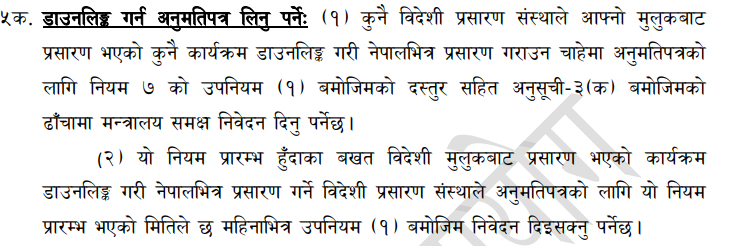 त्यसको (१) मा कुनै विदेशी प्रसारण संस्थाले आफ्नो मुलुकबाट प्रसारण भएको कुनै कार्यक्रम डाउनलिंक गरी नेपालभित्र प्रसारण गराउन चाहेमा अनुमतिपत्रको लागि नियम ७ को उपनियम (१) बमोजिमको दस्तुरसहित अनुसूची - ३ (क) बमोजिमको ढाँचामा मन्त्रालय समक्ष निवेदन दिनु पर्नेछ भनिएको छ । उपनियम (२)मा यो नियम प्रारम्भ हुँदाका बखत विदेशी मुलुकबाट प्रसारण भएको कार्यक्रम डाउनलिंक गरी नेपालभित्र प्रसारण गर्ने विदेशी प्रसारण संस्थाले अनुमतिपत्रको लागि यो नियम प्रारम्भ भएको मितिले छ महिनाभित्र उपनियम (१) बमोजिम निवेदन दिइसक्नु पर्ने छ भनिएको छ ।