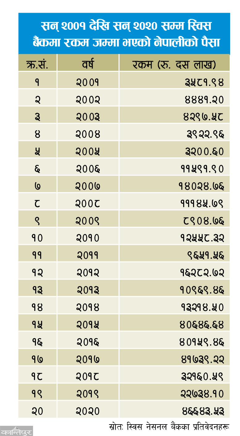 नेपालीले अवैध रूपमा ठूलो रकम स्विस बैंकमा जम्मा गरेका तथ्यहरू समेत सार्वजनिक भएका छन् । स्विस नेसनल बैंकको तथ्यांकअनुसार सन् १९९६ मा १ अर्ब ४६ करोड, सन् १९९७ मा १ अर्ब ८६ करोड, सन् १९९८ मा २ अर्ब १८ करोड, सन् १९९९ मा १ अर्ब ८४ करोड र सन् २००० मा २ अर्ब ३४ करोड रुपैयाँ जम्मा भएको देखिन्छ ।