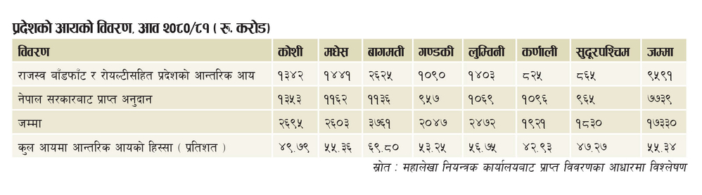 Bagmati Province and Gandaki Province have received significant royalties on electricity. Like the Koshi region, both these regions have abundant natural resources and resources. Lumbini region is good in mineral royalty. But despite the abundant potential of natural resources and resources, Karnali and Sudurpaschim Province are very weak in getting royalties. It is necessary for these provinces to work with long-term thinking. If revenue distribution and royalty are also considered as internal income of the province, the share of internal income in the total income is 55.34 percent. For the remaining 44.66 percent of income, the province depends on the grant from the Government of Nepal.