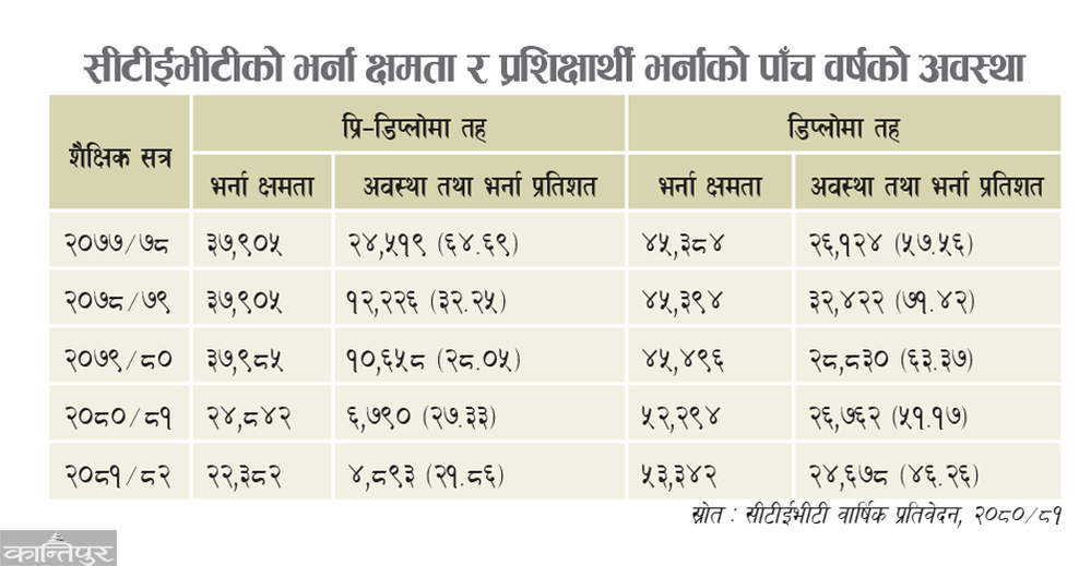 सीटीईभीटीले नेपालभर सञ्चालन गरेका प्राविधिक शिक्षा तथा व्यावसायिक तालिम (टीभीईटी) कार्यक्रमका प्रि–डिप्लोमा तथा डिप्लोमा तहमा विगत शैक्षिक वर्षदेखि नै भर्ना क्षमताअनुसार विद्यार्थीको भर्ना नभएको देखिन्छ, जसले उपलब्ध सिटहरूको प्रभावकारी उपयोगमा चुनौती उत्पन्न गरेको छ ।