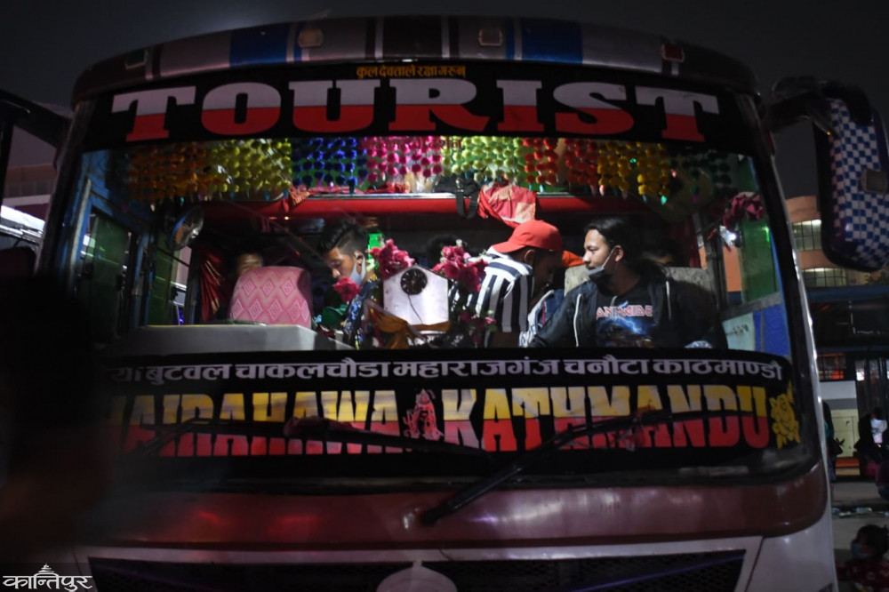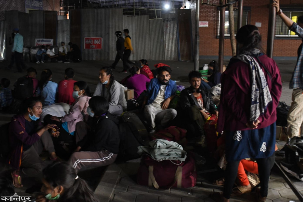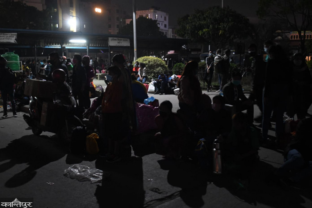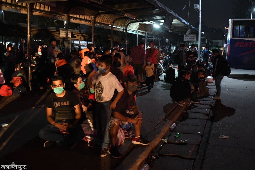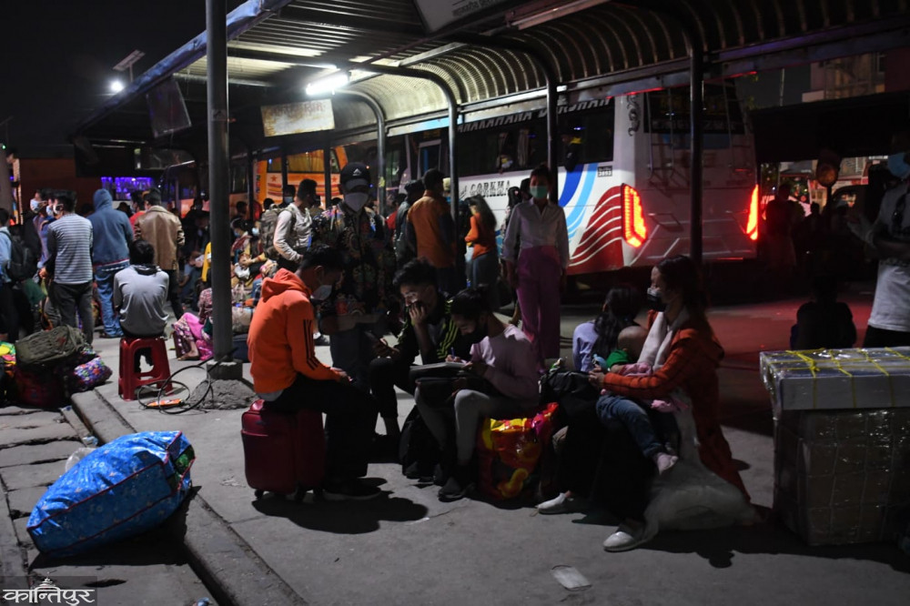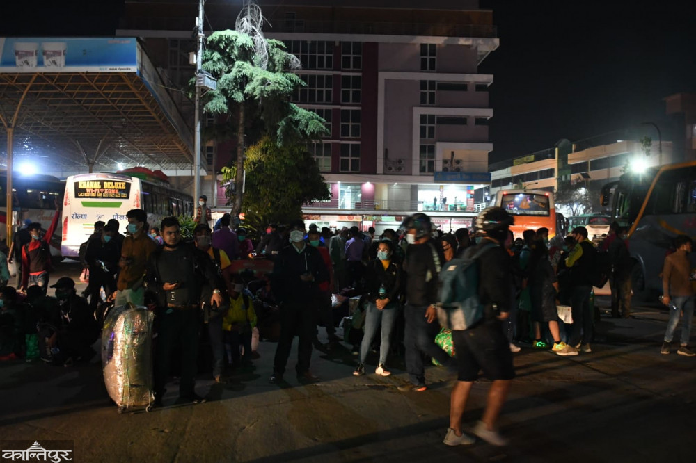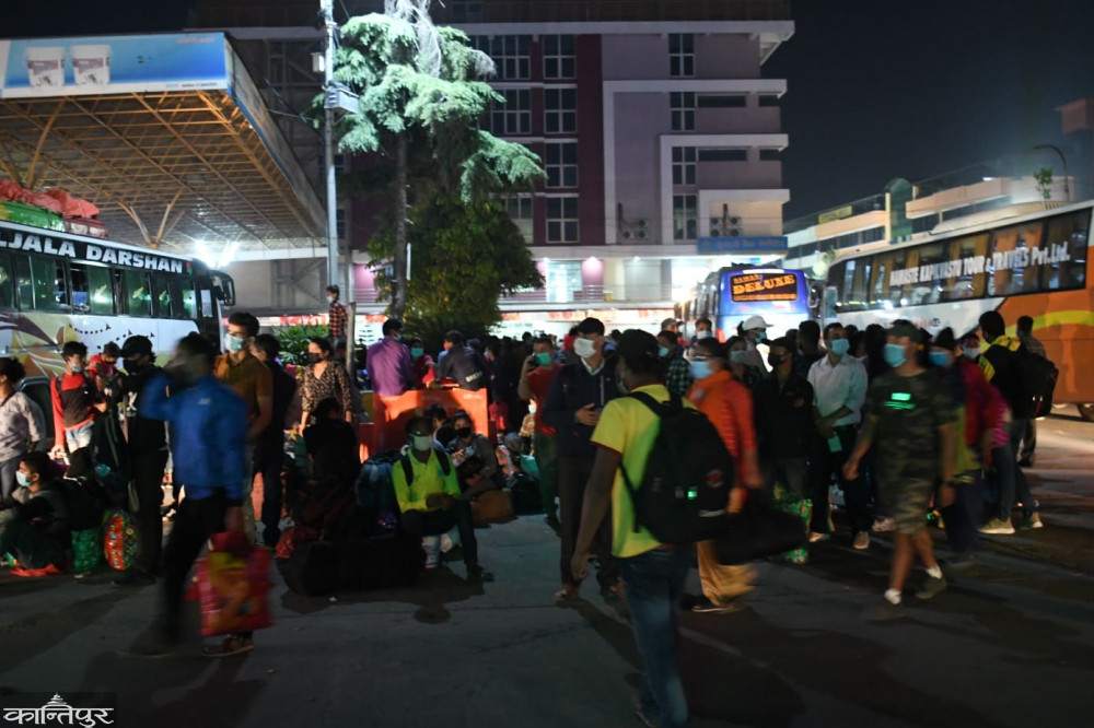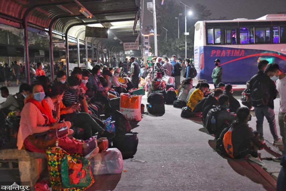 काठमाडौँ — कोरोना भाइरस रोकथाम र नियन्त्रणका लागि बिहीबारदेखि काठमाडौं उपत्यकामा निषेधाज्ञा लगाउने घोषणा भएदेखि नै सर्वसाधारणहरु गाउँघर फर्कने क्रम तीव्र बनेको छ । सोमबार, मंगलबार, बुधबार काठमाडौंको नयाँ बसपार्क, पुरानो बसपार्कमा घर जानेहरुको लाइन झिसमिसेदेखि नै लागेको थियो । एक्कासी जिल्लाहरुमा फर्कने यात्रुको संख्या बढेपछि सवारी साधनले पनि ओसारी नसक्नु देखिन्थे । बुधबार घर हिँडेकाहरु बिहान, दिउँसोसम्ममा हजारौं गए पनि कतिपय नागरिक त बेलुकीसम्मै गाडीको पर्खाइमा बसपार्कमा घुइँचो थियो ।