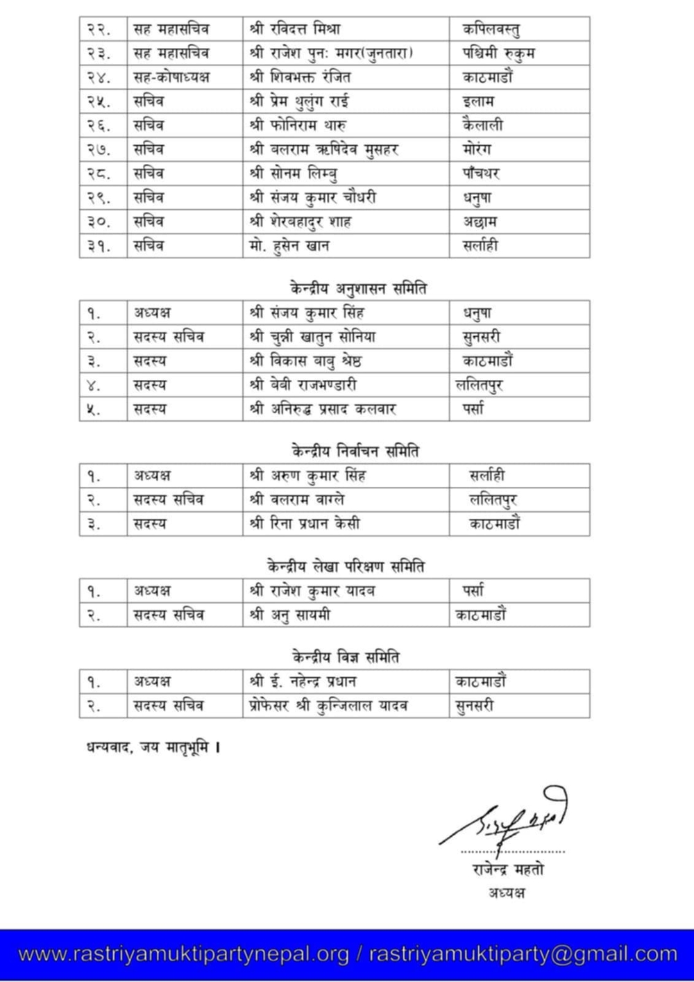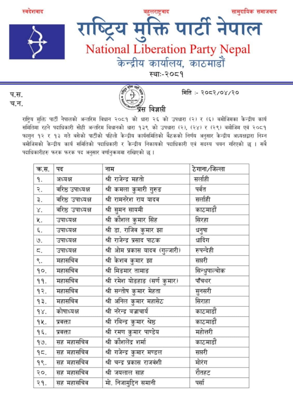 अध्यक्ष, तीन वरिष्ठ उपाध्यक्ष, चार उपाध्यक्ष, पाँच महासचिव, सात सहमहासचिव, दुई प्रवक्ता, कोषाध्यक्ष, सहकोषाध्यक्ष र सात जना सचिव चयन गरिएको विज्ञप्तिमा उल्लेख छ । यस्तै अध्यक्ष महतोले केन्द्रीय अनुशासन समिति, केन्द्रीय निर्वाचन समिति, केन्द्रीय लेखा परीक्षण समिति र केन्द्रीय विज्ञ समितिका अध्यक्ष, सदस्य सचिव र सदस्यहरुसमेत चयन गरेका छन् ।