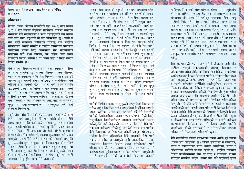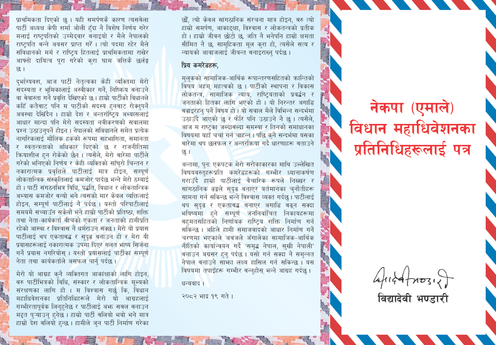 Even though former president Bidya Bhandari's membership dispute was not admitted in the second legislative convention of UML, she has written an open letter to the convention representative asking her to correct the decision to keep her membership renewal 'pending'.