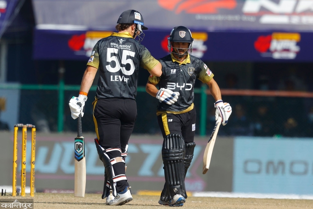 धवनसँगै मक्सुद ११ बलमा १ चौका प्रहार गरी १४ रन बनाई अविजित रहे । यी दुईले छैटौं विकेटमा ३३ बलमा ६५ रनको अविजित साझेदारी गरेका थिए । करणले खेलको पहिलो ओभरमै देव खनाललाई शून्यमा एलबीडब्लु आउट गरेका थिए । चाडविक वाल्टनले ५ चौका प्रहार गर्दै १५ बलमा २१ रन बनाए । उनलाई जेहरार्ड इरसमसको बलमा करणले सानदार क्याच लिई पेभेलियन फर्काएका थिए ।